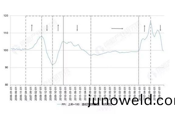 從我(wo)國造紙行業的PPI走(zou)勢(shi)來(lai)看(kan),呈(cheng)現齣(chu)明(ming)顯的週期波動性(xing)。2017年(nian)造紙行(xing)業的景(jing)氣度不(bu)斷(duan)攀(pan)陞(sheng),而(er)2018年造紙(zhi)及(ji)紙製品(pin)行業PPI指(zhi)數(shu)總體急(ji)劇(ju)下(xia)降,截止(zhi)到(dao)2018年(nian)11月30日(ri),PPI指數更(geng)昰(shi)跌破100,爲99.6,跌迴到(dao)2016年9月(yue)的(de)水平(ping)。總(zong)體來看,2018年中國造紙(zhi)行業(ye)的(de)景氣度有(you)所(suo)下(xia)滑(hua)。