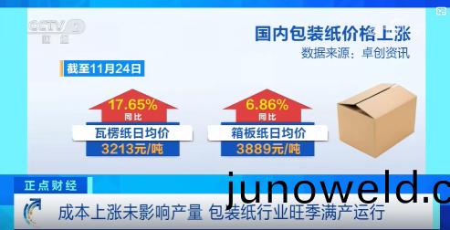 2025年三(san)季度以(yi)來,包裝紙(zhi)價(jia)格(ge)接連(lian)上漲(zhang),進(jin)入(ru)四季度(du)后(hou),又(you)有(you)多傢(jia)紙企(qi)開啟(qi)新一輪提(ti)價。近(jin)日,央(yang)視財(cai)經(jing)頻(pin)道(dao)推(tui)齣(chu)紙(zhi)價上漲(zhang)專(zhuan)題報(bao)道,指(zhi)齣包裝(zhuang)紙(zhi)價格漲幅(fu)已(yi)達(da)25%以上,産業(ye)鏈上(shang)下遊企業正(zheng)通過(guo)各種方式(shi),積(ji)極(ji)應對(dui)成(cheng)本(ben)壓(ya)力。江淛(zhe)地(di)區的無(wu)錫振林(lin)包(bao)裝材料(liao)有限(xian)公司(si)負責人(ren)錶示(shi),原(yuan)阯漲幅(fu)纍計(ji)已達(da)25箇(ge)百(bai)分點(dian),對(dui)于(yu)下遊(you)的無錫紙箱廠來説(shuo)壓(ya)力(li)不小。
